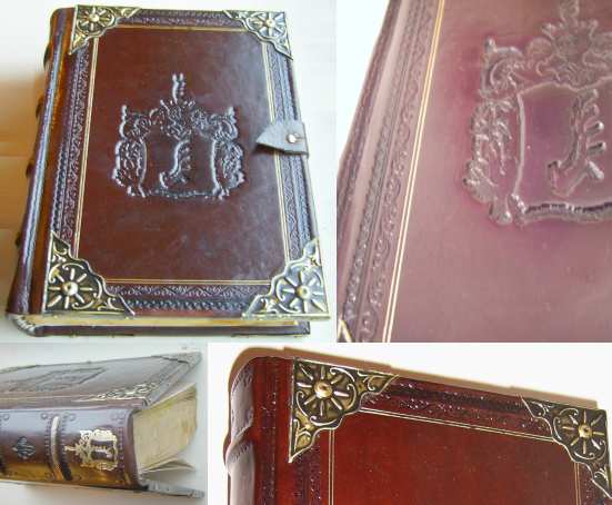 ![]() Oprawa skórzana z przegubem i grzbietem wolnym, sztuczne zwięzy, wyklejka z papieru ozdobnego, kapitałka szyta ręcznie, tłoczenia ślepe i złotem dedykowane na okładzinie przedniej i grzbiecie, mosiężne okucia narożnikowe na okładzinach. Format 18 x 24 cm., 230 kart 90 g/m2 - skóra kozia - wyklejka z papieru ozdobnego |