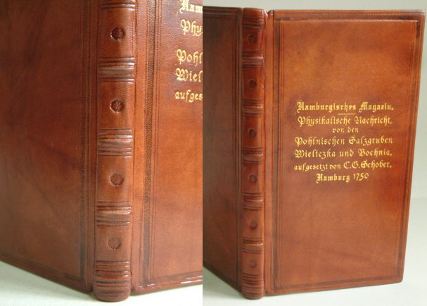 Oprawa skórzana szyta na prawdziwe zwięzy, kapitałka ręcznie szyta, złocona tytulatura na przedniej okładce, tłoczenia suche na grzbiecie i okładkach. Format ca B7, 10 ark. - skóra kozia antykowana ręcznie - wyklejka z papieru antykowanego |