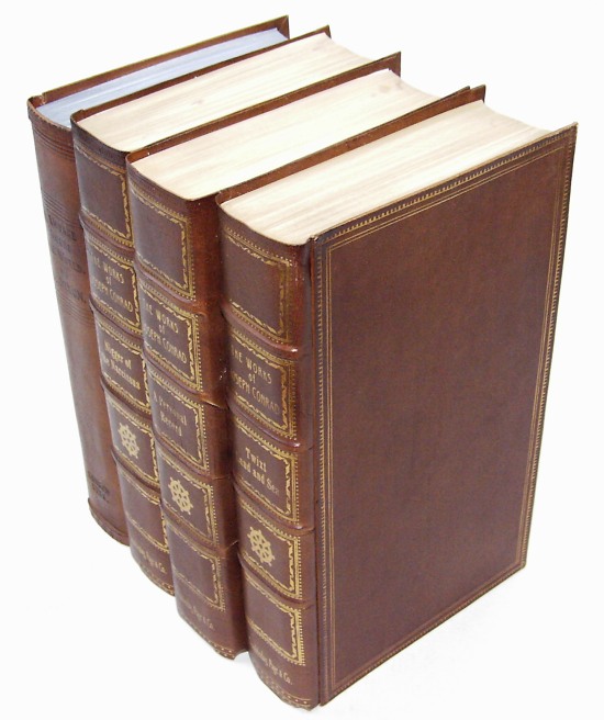 Fragment imitacji księgozbioru, atrapy oprawione w skórę, imitacje zwięzów - przestrzenne, widoczne z góry prawdziwe krawędzi kart i boczne "okładki".