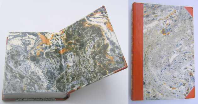 Oprawa skórzana uproszczona, wyklejona papierem marmoryzowanym ręcznie, szycie maszynowe, wyklejka z papieru ozdobnego, zwięzy na grzbiecie, kapitałka szyta ręcznie, złocenia tytulatury na grzbiecie, tłoczenia złotem. - Format B5, ok. 11 ark. - skóra cielęca antykowana - papier wyklejkowy marmoryzowany ręcznie - marmurkowy |