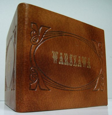 Oprawa skórzana stylizowana, wyklejka z papierów ręcznie marmoryzowanych, tłoczenia tytulatury złotem na okładce, zdobienia suche i złotem, barwione krawędzi plansz. Edycja limitowana. - Format ca B4 - skóra licowa ręcznie antykowana |