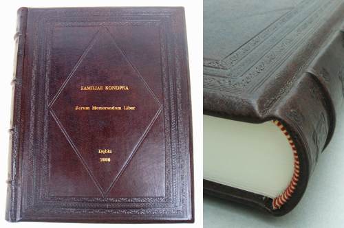 ![]() Oprawa skórzana, ręczne szycie, zwięzy na grzbiecie, kapitałki szyte ręcznie, złocona tytulatura na okładce przedniej, tłoczenie ornamentów suche na grzbiecie i okładkach Format A4+, 120 kart. papier ozdobny 150 g/m2 - skóra licowa - wyklejka z papieru ozdobnego |