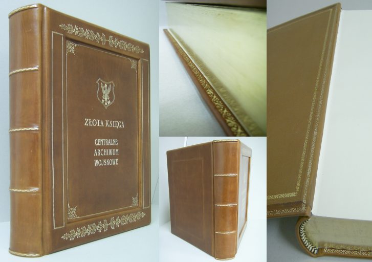 ![]() Oprawa skórzana, szycie na pojedyncze sznury, prawdziwe zwięzy, kapitałka szyta ręcznie, złocona tytulatura i ornamenty na okładce przedniej, ślepe tłoczenia liniakami na okładce tylnej, dublura - skóra zdobiona na okładkach na zewnątrz i od wewnątrz, złocone prawdziwym złotem brzegi kart, zdobione kanty okładek, reliefowe wgłębienie na okładce przedniej. Format 32 x 44 cm., 250 kart pap. 150 g/m2, - skóra koźla licowa - wyklejka skórzana |