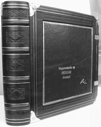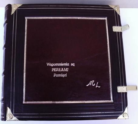 Oprawa skórzana, szycie ręczne na taśmy, wyklejka z papieru ozdobnego, tłoczenia ślepe, srebrzenia ornamentów, tytulatury, okucia i zapinki metalowe, aplikacja skórzana - Format 24 x 32 cm., 350 kart. papier. fly color 120 g/m2 - skóra cielęca nr 7: CBA 392 - skóra cielęca nr 2: K 23 - wyklejka z papieru ozdobnego |