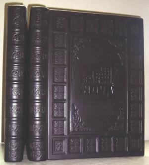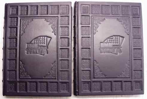 Oprawa skórzana z grzbietem zwartym, szycie na taśmy, ułatwiające szerokie (na płask) rozwarcie kart, wysokie zwięzy, wyklejka przeszywana z papieru czerpanego, wzmocniona płótnem i scyzurą, kapitałka płaska szyta ręcznie, logotyp i ornament tłoczony matrycą, tłoczenia ślepe reliefowe. - Format 30 x 38 cm., ok. 100 kart pap. ozdobnego 160 g/m2. - skóra cielęca - wyklejka z papieru czerpanego |