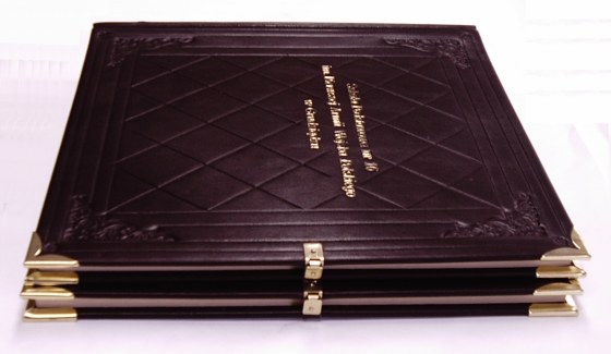 ![]() Oprawa skórzana, szycie ręczne na taśmy, kapitałka szyta ręcznie, złocona tytulatura na okładce, ślepe tłoczenia liniakami na okładzinach oraz katalogowymi tłocznikami na grzbiecie. - Format 26 x 26 cm., 100 kart, papier flycolor 100 g/m2 - skóra koźla licowa - wyklejka z papieru ozdobnego 120 g/m2 |