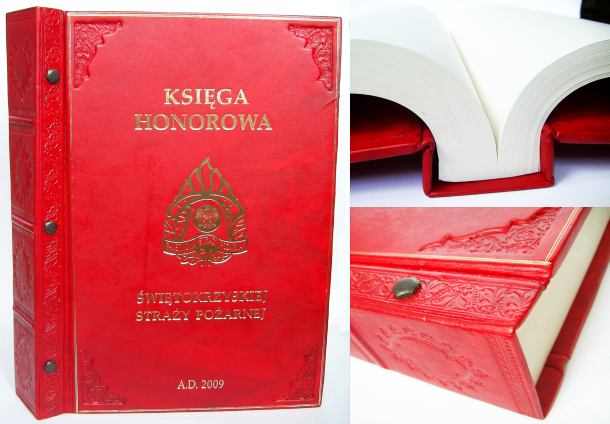 ![]() Oprawa skórzana, karty skręcane mosiężnymi śrubami, głębokie tłoczenia ślepe i złotem, skórzana dublura (skóra na wewnętrznej stronie okładek) Format A3+, 200 kart, papier ozdobny 140 g/m2 - skóra naturalna - wyklejka z papieru ozdobnego |