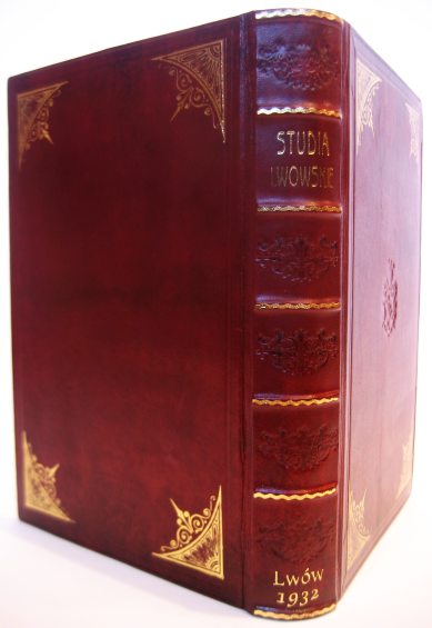 Oprawa skórzana stylizowana, kapitałka szyta ręcznie, tłoczenia ślepe i złotem, tytulatura na grzbiecie, stylizacja okładek, barwienie krawędzi kart. - Format ca B5 - skóra kozia - wyklejka papier ręcznie marmoryzowany |