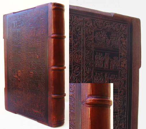 Oprawa skórzana, ręczne szycie na 5 sznurów, prawdziwe zwięzy, kapitałka szyta ręcznie, tłoczenie matrycą okładek, antykowana skóra, barwione krawędzi kart, stylizowane krawędzi okładek - Format: A4, ok. 300 kart - skóra swinka - wyklejka papier ręcznie marmoryzowany |