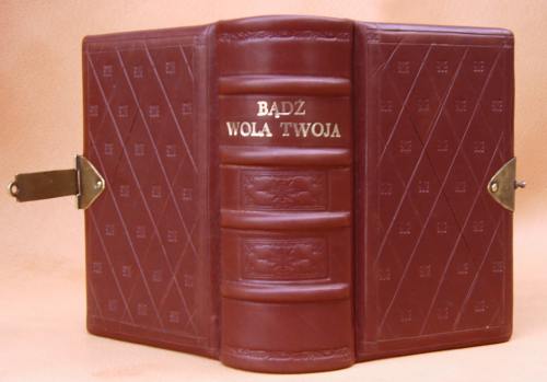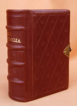 Oprawa skórzana, wyklejka z papieru czerpanego, ręczne szycie na 3 taśmy, kapitałka płaska szyta ręcznie, sztuczne zwięzy, złocona tutulatura, tłoczenia ślepe grzbietu i okładek, zapinka mosiężna - Format: 16 x 11 cm, papier 100 gr. - skóra cielęca nr 2: K 23 - wyklejka z czerpanego papieru 120 gr. |