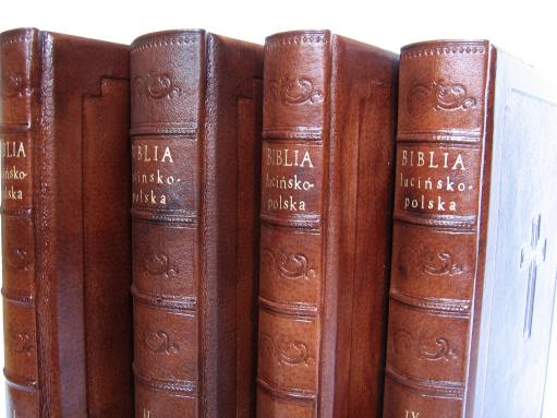 Oprawa skórzana Biblii z początku XIX wieku, kapitałka szyta ręcznie, wyklejka z papieru antykowanego, tłoczenie złotem tytulatury na grzbiecie, tłoczenia suche ornamentów, relief na okładkach, ręcznie szyte kapitałki Format ca B5, 45 ark. - skóra cielęca - papier antykowany |