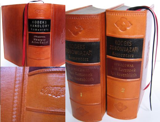 Oprawa skórzana, dwa szyldy skórzane na grzbiecie, kapitałka szyta ręcznie, wyklejka z papieru antykowanego, tłoczenie złotem tytulatury, tłoczenia ornamentów na okładkach, barwione krawędzi kart, tasiemki przekładkowe. - Format ca B5 - skóra kozia - papier antykowany |
