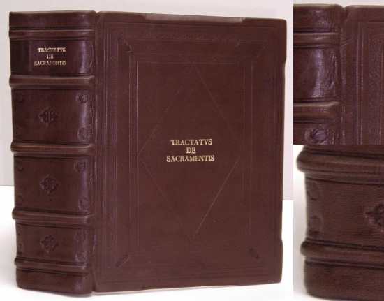 Oprawa skórzana oporkowana, stylizowana, ręczne szycie na sznury, prawdziwe zwięzy, kapitałka szyta ręcznie, wyklejka z papieru ręcznie marmoryzowanego, tłoczenie złotem tytulatury na grzbiecie i okładce, tłoczenia suche ornamentów z katalogu - Format 24 x 28 cm, ok. 60 ark. - skóra cielęca - papier ręcznie marmoryzowany |