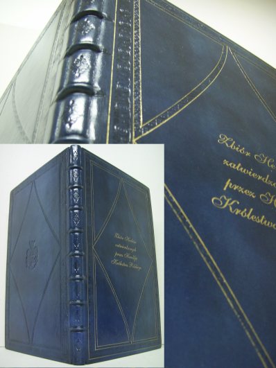 Oprawa skórzana, wyklejka z papieru ozdobnego, szycie na prawdziwe zwięzy, kapitałka szyta ręcznie, tłoczenia ślepe grzbietu, tłoczenia ślepe i złotem na okładkach, złocona tytulatura stylizowana. - Format: folio - skóra szlachetna - wyklejka z ręcznie marmoryzawanego papieru |