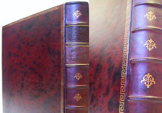 Oprawa ze skóry stylizowana albumowa, kapitałka szyta ręcznie, tłoczenia ślepe i złotem, stylizacja okładek, barwienie brzegów kart. - Format folio - skóra naturalna ręcznie marmoryzowana - wyklejka papier ręcznie antykowany |