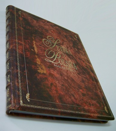 Oprawa skórzana stylizowana, przeszywana, kapitałka szyta ręcznie, tłoczenie złotem tytulatury, grzbietu, stylizacja okładek, barwienie krawędzi kart. - Format ca B4 - skóra kozia ręcznie marmoryzowana - wyklejka papier ręcznie marmoryzowany |