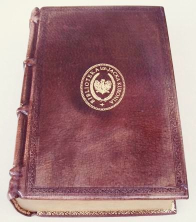 Oprawa skórzana stylizowana na starodruk, szycie ręczne na prawdziwe zwięzy, wyklejka z papieru ręcznie antykowanego, tłoczenie złotem tytulatury na grzbiecie, zdobienia złotem i suche na okładkach, kapitałka szyta ręcznie, złocone kanty okładek - Format ca B5 - skóra kozia ręcznie antykowana |