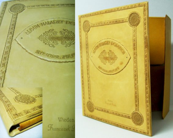 Oprawa skórzana stylizowana, teka na stare grafiki, wyklejka skórzana i z papieru ręcznie antykowanego, skórzane skrzydełka, tłoczenie suche tytulatury na okładce przedniej, zdobienia reliefowe na okładkach, tłoczenia suche. - Format ca B2 - skóra cielęca antykowana |