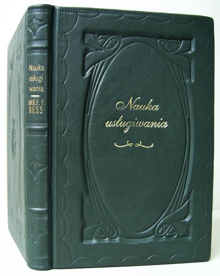 Oprawa skórzana stylizowana, szycie ręczne na prawdziwe zwięzy, wyklejka z papieru ręcznie marmoryzowanego, tłoczenie złotem tytulatury na okładce przedniej i grzbiecie, zdobienia reliefowe na okładkach, tłoczenia suche. - Format ca B5 - skóra cielęca |