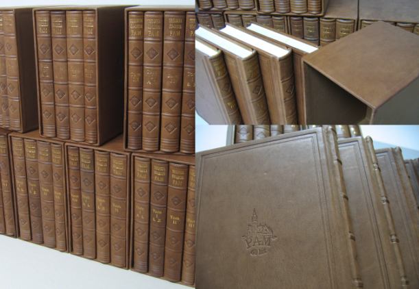 Oprawa skórzana dedykowana, kapitałka wykonana ręcznie, tłoczenia tytulatury złotem na grzbiecie i okładce, zdobienia suche i złotem, barwione krawędzi kart, futerał skórkowy Edycja limitowana. - Format ca B5 - skóra kozia |