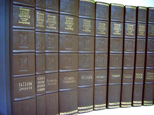 Oprawa skórzana stylizowana, kapitałka wykonana ręcznie, sztuczne zwięzy, wyklejka z papierów ręcznie marmoryzowanych, tłoczenia tytulatury złotem, na okładce zdobienia suche i złotem, barwione krawędzi kart. Edycja limitowana. - Format ca B4 - skóra kozia |