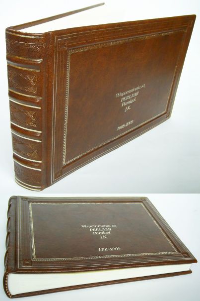 ![]() Oprawa skórzana, ręczne szycie kart, zwięzy na zdobionym grzbiecie, kapitałki szyte ręcznie, tłoczenia na okładce złotem i ślepe, relief na okladce przedniej, wszyte przekładki dystansujące Format B3+ poziomy, 200 kart, papier ozdobny 120 g/m2 - skóra licowa - wyklejka z papieru ozdobnego |