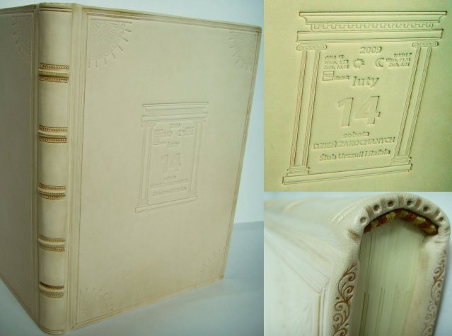 ![]() Oprawa skórzana albumowa, ręczne szycie kart, zwięzy na zdobionym grzbiecie, kapitałki szyte ręcznie, tłoczenia na okładce ślepe, zdobienia krawędzi okładek i krańców grzbietu, wszyte przekładki dystansujące Format B3+, 100 kart, papier ozdobny 150 g/m2 - skóra licowa - wyklejka z papieru ozdobnego |