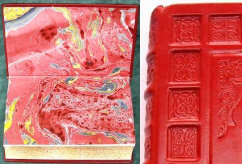 Oprawa skórzana z grzbietem zwartym, ręczne szycie kart, zwięzy na tłoczonym grzbiecie, kapitałki szyte ręcznie, głębokie tłoczenia ślepe reliefowe na okładkach Format A4+, 320 kart, papier ozdobny 90 g/m2, zdobione brzegi kart, - skóra licowa - wyklejka z papieru ręcznie marmoryzowanego |
