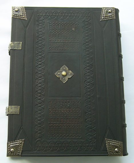 ![]() Oprawa skórzana odtwarzająca oprawę dawną, karty szyte ręcznie, wysokie zwięzy na grzbiecie, kapitałki szyte ręcznie, głębokie tłoczenia ślepe, barwione brzegi kart, zdobione krawędzi okładek, okucia mosiężne - narożniki, guzy centralne, pasek skórzany Format ca A3+, ca 200 kart - skóra naturalna - wyklejka z papieru ozdobnego |