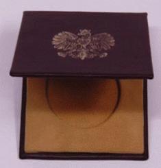Pudełko na medal, oprawa skórzana, wnętrze skórzane ukształtowane, ręczne tłoczenie złotem