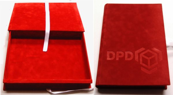 Pudełka na obiekt formatu B5 - atrapa książki, zakrąglone krawędzi "kart" i "grzbiet", oklejone materiałem imitującym zamsz, wnętrze ukształtowane wg rozmiarów przedmiotu zawartości, tłoczenia ślepe na wieczku, tasiemki umożliwiające trwałe zamknięcie pudełka