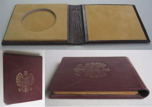 Pudełko na medal, oprawa skórzana, wnętrze skórzane ukształtowane wg rozmiaru obiektu,