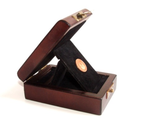 Pudełko na medal, oprawa skórzana, konstrukcja drewniana, tłoczenie na wieczku logotypu, uchylne wieczko na zawiasie mosieżnym ukrytym pod skórą, uchylny panel z zagłębieniem dostosowanym do rozmiarów obiektu, wnętrze welurowe, zapinka mosiężna Rozmiar dedykowany - skóra szlachetna - wnętrze welurowe |