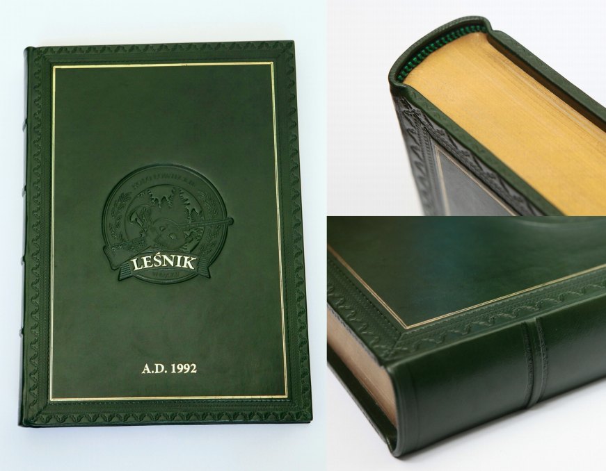 ![]() Oprawa skórzana, karty szyte ręcznie, wysokie zwięzy na grzbiecie, kapitałki szyte ręcznie, głębokie tłoczenia ślepe i złotem, barwione brzegi kart Format ca 30 x 42 cm, ca 250 kart - skóra naturalna - wyklejka z papieru ozdobnego |