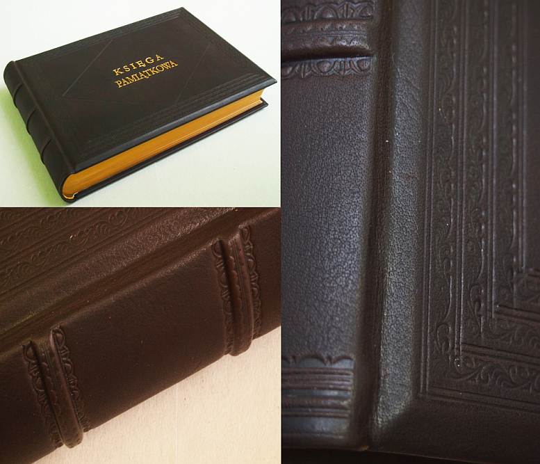 ![]() Oprawa skórzana albumowa, ręczne szycie z listwami - ruchomy grzbiet pozwala na szerokie otwarcie, bez fałd, kart albumu, zwięzy na grzbiecie, kapitałki szyte ręcznie, tłoczenie ornamentów suche i złotem na okładkach Format 43 x 31 cm, format poziomy, 200 kart, 50 przekładek dystansujących papier ozdobny albumowy 150 g/m2 skóra licowa antykowana wyklejka z papieru ozdobnego |