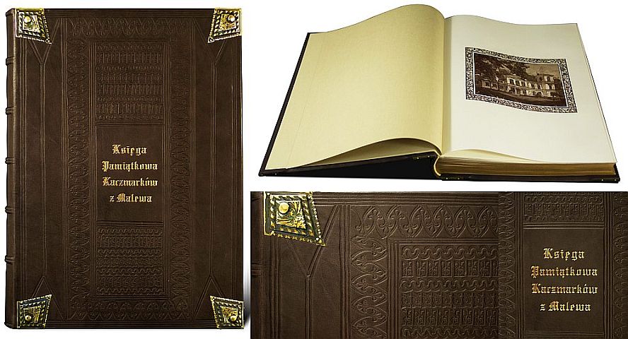 ![]() Oprawa skórzana albumowa rodowa, ręczne szycie z przekładkami dystansującymi karty, zwięzy na grzbiecie, kapitałki szyte ręcznie, tłoczenie suche i złotem na okładkach i grzbiecie, złocone brzegi kart, druk karty pierwszej, stylizowane mosiężne okucia narożnikowe Format 43 x 31 cm 150 kart, 50 przekładek papier ozdobny 150 g/m2 skóra licowa antykowana wyklejka z papieru ręcznie marmoryzonego złocone brzegi kart |