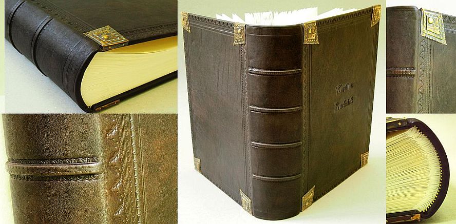 ![]() Oprawa skórzana albumowa, księga rodzinna, ręczne szycie z przekładkami dystansującymi karty, zwięzy na grzbiecie, kapitałki szyte ręcznie, tłoczenie suche na okładkach i grzbiecie, stylizowane mosiężne okucia narożnikowe Format 43 x 31 cm 150 kart, 150 przekładek papier ozdobny 150 g/m2 skóra licowa antykowana wyklejka z papieru ręcznie marmoryzonego stylizowane mosiężne okucia narożnikowe |