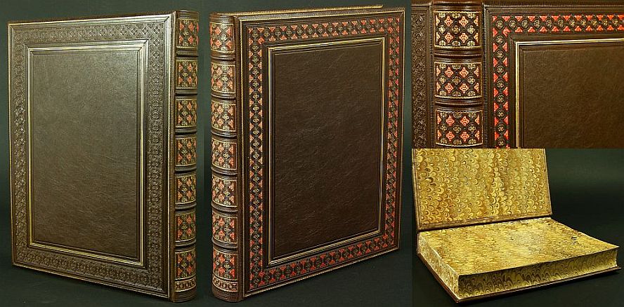![]() Oprawa skórzana albumowa, księga nie sygnowana, ręczne szycie z przekładkami dystansującymi karty, zwięzy na grzbiecie, kapitałki szyte ręcznie, bogate tłoczenie suche i złotem na okładkach, grzbiecie, kancikach i krawędzi okładek, skóra ręcznie malowana, brzegi kart i wyklejki ręcznie marmoryzowane Format 43 x 31 cm 200 kart, 50 przekładek papier ozdobny 150 g/m2 skóra licowa antykowana wyklejka z papieru ręcznie marmoryzonego brzegi kart ręcznie marmoryzone |