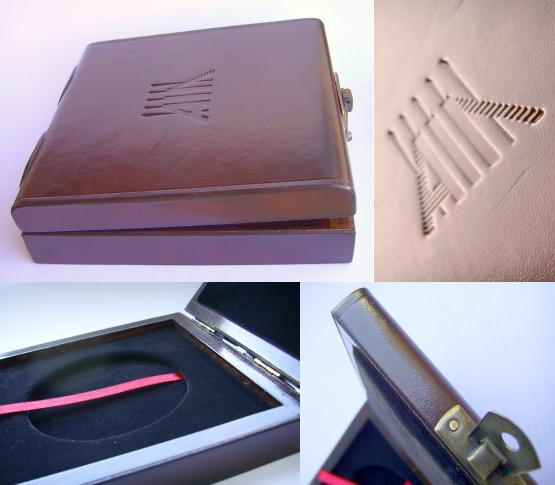 Luksusowe pudełka na monetę lub medal, skórkowe o konstrukcji drewnianej, wyścielone materiałem zamszopodobnym - flokiem, zagłębienie na obiekt w dnie pudełka z tasiemką, na wewnętrznej stronie wieczka elastyczna poduszka oklejona flokiem, wieczko na ukrytych metalowych zawiasach, metalowa zapinka, głębokie tłoczenie logotypu na wieczku metodą na ślepo. Rozmiar 14 x 14 x 4 cm - skóra licowa szlachetna ręcznie barwiona - materiał typu flock - tasiemka bawełniana |